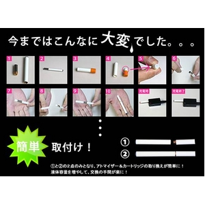タバコを模造した電子機器(電子タバコ)で、吸い口を吸引することにより、充電式電池でコイルを熱し、カートリッジ内の液体を蒸気にして、煙(ミスト)噴射します。またフィルター部分のカートリッジ式の液体に味をつけることにより、メンソール、ローズ、グレープフルーツ、ストロベリーなど様々な風味を楽しめます。