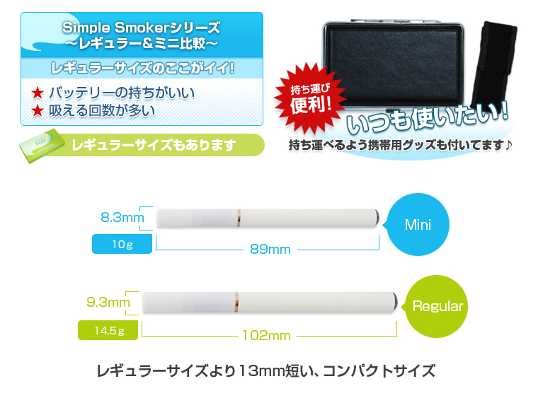日本でも新たなブームとなった電子タバコを、より手軽に皆様にお届けしたい。その想いから生まれた「Simple Smoker(シンプルスモーカー)」シリーズから、新軽量設計でより軽く、持ちやすい"ミニ"タイプが登場!本体の長さは89mmと短く、キングサイズのタバコとほぼ同じ!しかも重さはたったの10gと軽いので、くわえタバコもOK!!