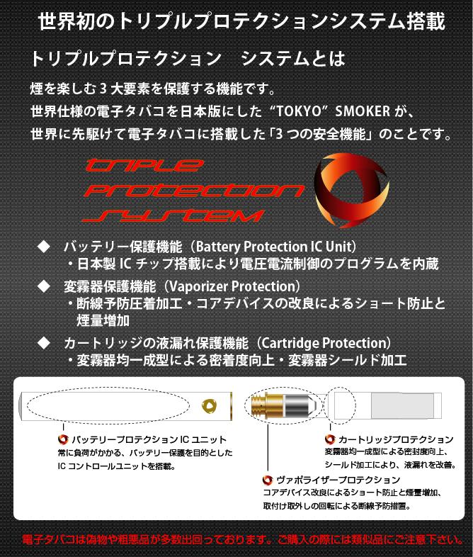 従来のTOKYOSMOKERに「バッテリー保護機能」「変煙器保護機能」「カートリッジ液漏れ保護機能」の3つ保護機能を追加した「トリプルプロテクションシステム」を搭載しました!