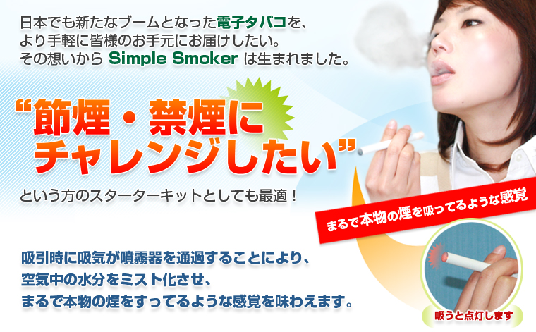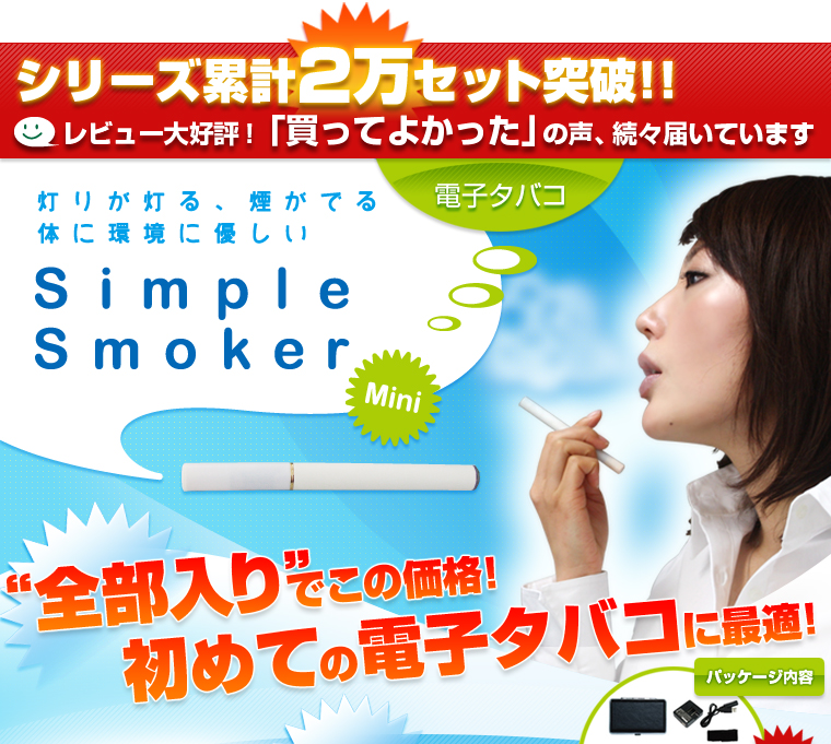 日本でも新たなブームとなった電子タバコを、より手軽に皆様にお届けしたい。その想いから生まれた「Simple Smoker(シンプルスモーカー)」シリーズから、新軽量設計でより軽く、持ちやすい"ミニ"タイプが登場!本体の長さは89mmと短く、キングサイズのタバコとほぼ同じ!しかも重さはたったの10gと軽いので、くわえタバコもOK!!