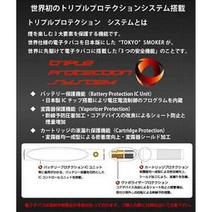 従来のTOKYOSMOKERに「バッテリー保護機能」「変煙器保護機能」「カートリッジ液漏れ保護機能」の3つ保護機能を追加した「トリプルプロテクションシステム」を搭載しました!