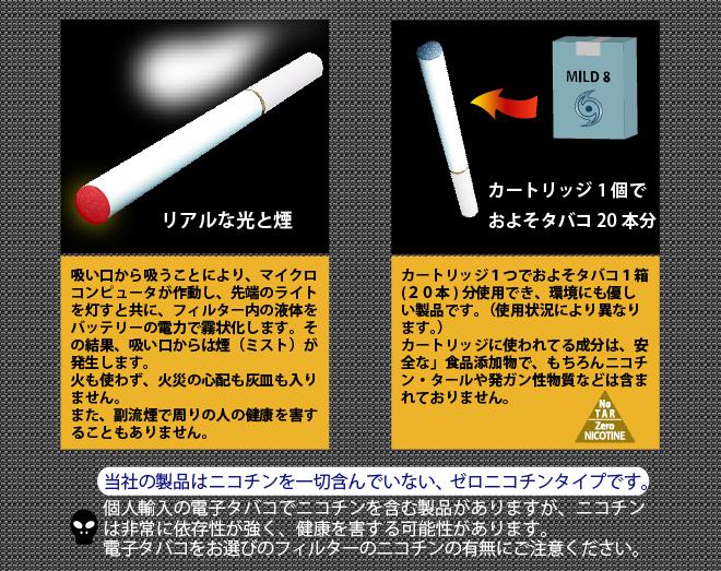 本製品は吸うことにより作動し、先端のライトを灯すと共に、カートリッジ内の液体をバッテリーの電力で霧状ミスト(先端からではなく吸い口から粒子の細かな煙)を発生します。
